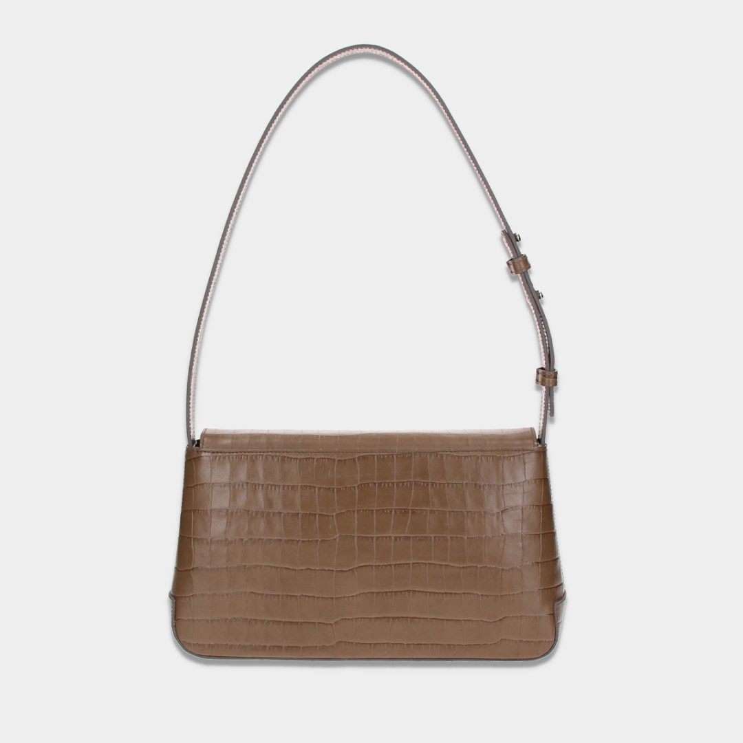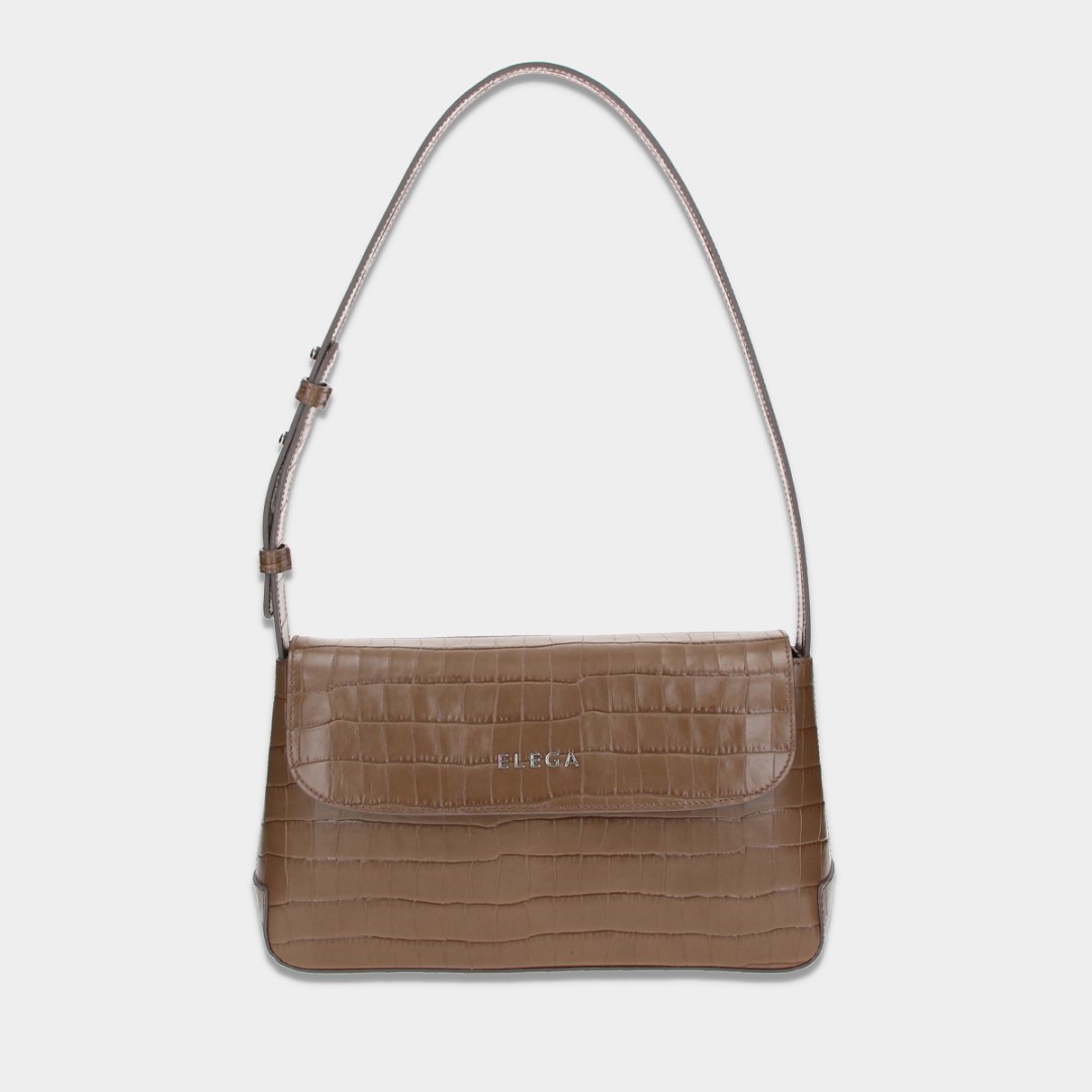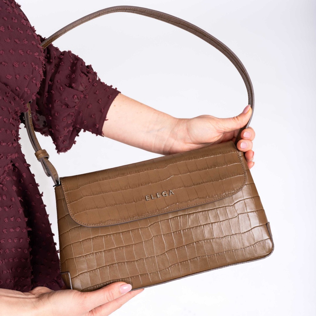 Nadčasová středně velká klopnová kabelka na rameno. Kabelka má jedno držadlo, které lze regulovat díky ozdobným trnům.Vyrobena je z hovězinové kůže s designem kroko. Na předním díle se nachází kovové logo ELEGA, a tak působí velice elegantním dojmem. Uvnitř kabelky je jedna zipová a jedna otevřená kapsička.